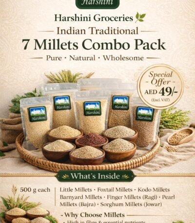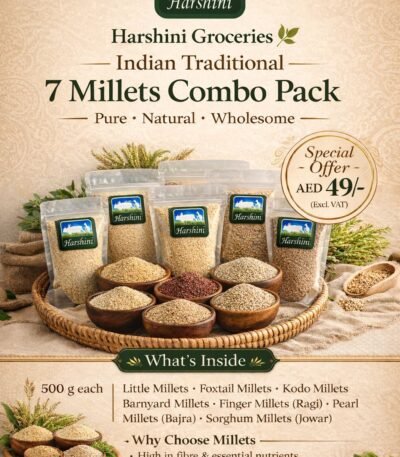 Indian Traditional Healthy 7 Millets Combo Pack Pure • Natural • Wholesome 🔥 Special Offer Price Only AED 49/- (Excl. VAT) 📦 Pack Details: 500 g each * Little Millets * Foxtail Millets * Kodo Millets * Barnyard Millets * Finger Millets (Ragi) * Pearl Millets (Bajra) * Sorghum Millets (Jowar) ✨ Why Millets? (Optional for poster) * Rich in fibre & nutrients * Supports digestion & diabetes-friendly * Traditional Indian superfoods * Naturally gluten-free